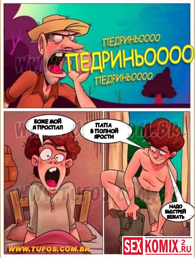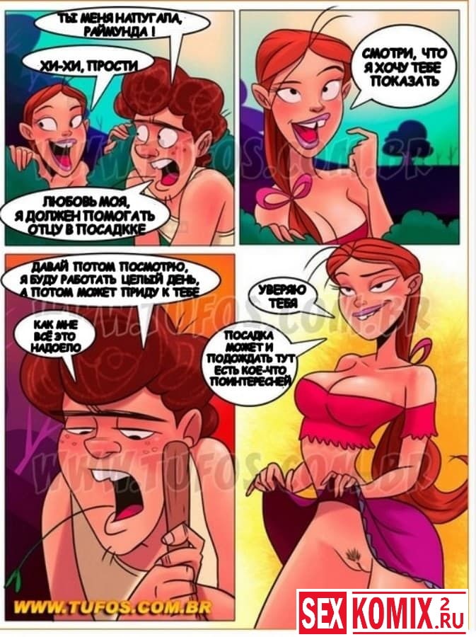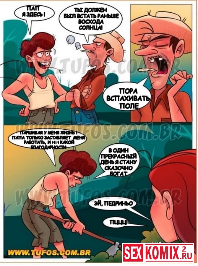 Порно комикс Деревенская семейка. Часть 5. Посадка на ферме. Заводящий порно комикс новой истории из жизни деревенской семейки. На этот раз настало время посадки. Педриньо проспал, и сейчас на него орет отец и заставляет быстрее приниматься за работу. А парню так не хочется ковыряться в земле, тем более его сиськастая подруга Раймунда предлагает ему тоже потрудиться, но немного в другой сфере.