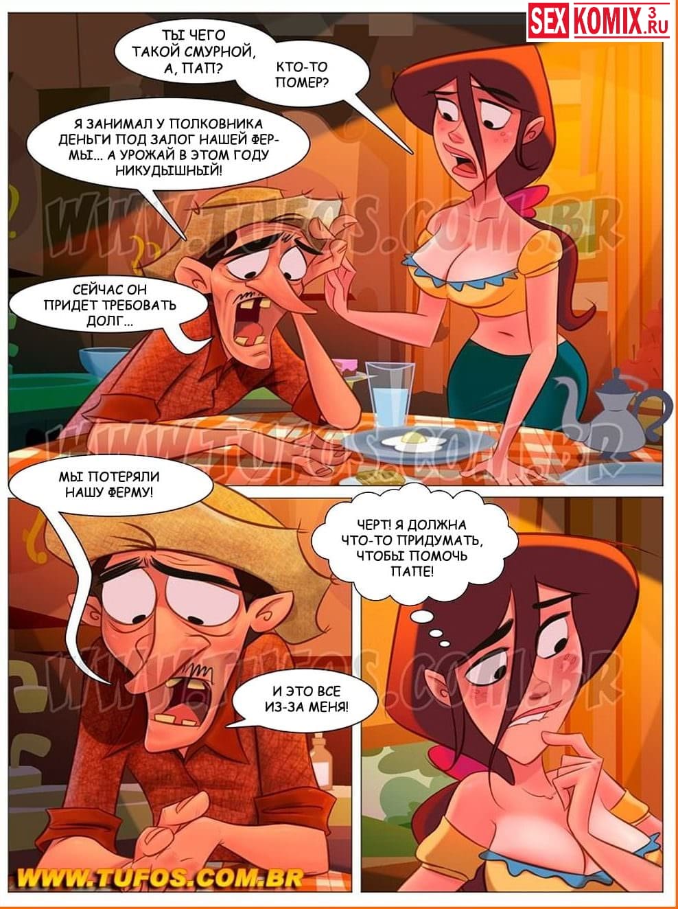 Читайте секс комикс «Деревенская семейка. Часть 13. Закладная на ферму». В этой части эротического комикса вы узнаете, как девушка помогла своему отцу решить проблему с долгом. Когда полковник пришёл за своими деньгами, девушка начала вертеть перед ним своей секси жопкой.