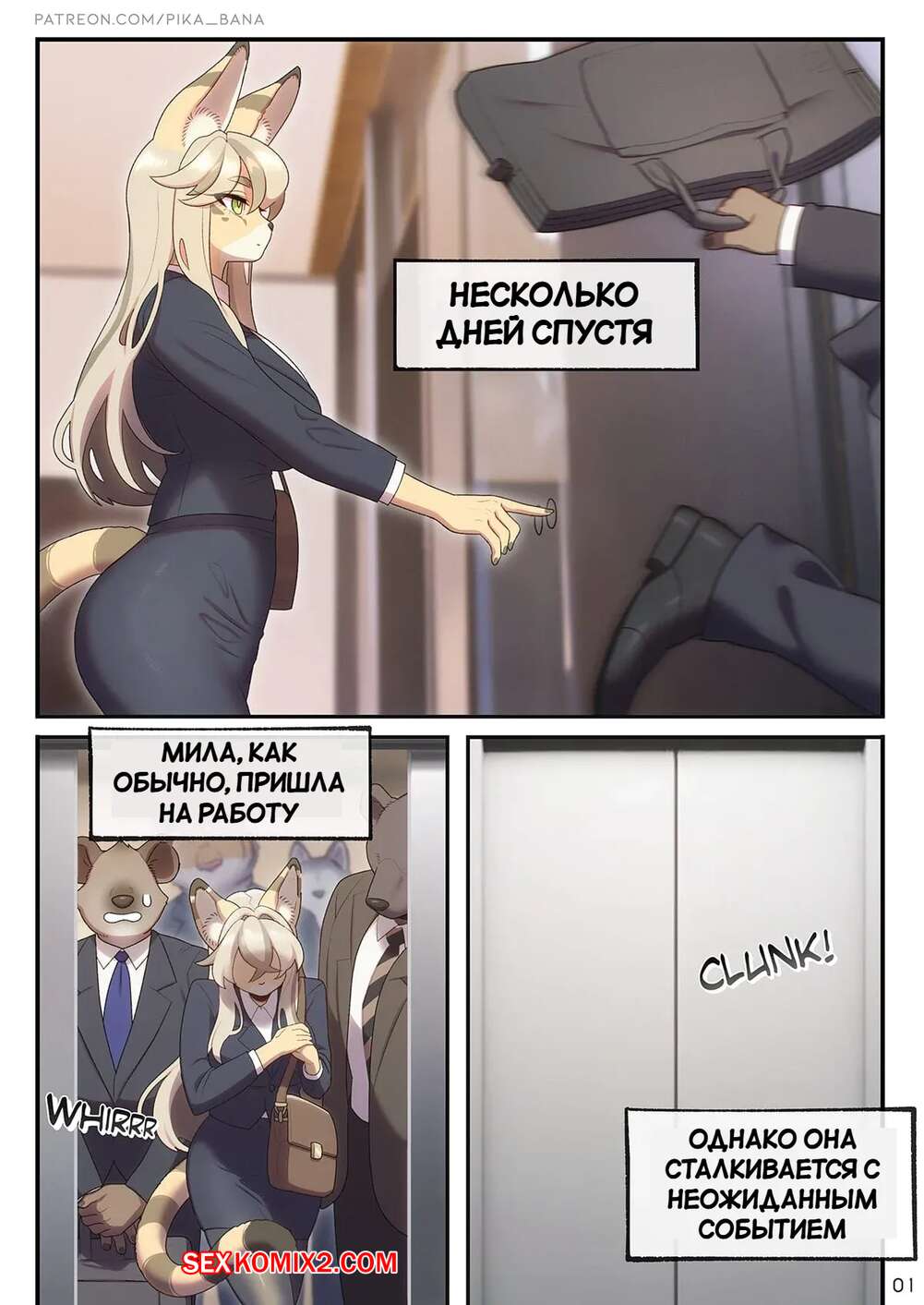 Порно комикс Работа СЕКСретаря. Часть 2. Strong Bana Горячая блондинка фурри ехала в лифте со своими коллегами. Лифт застрял, а парни решили воспользоваться моментом и выебали красотку во все дырочки, заполнив ее своей горячей спермой.
