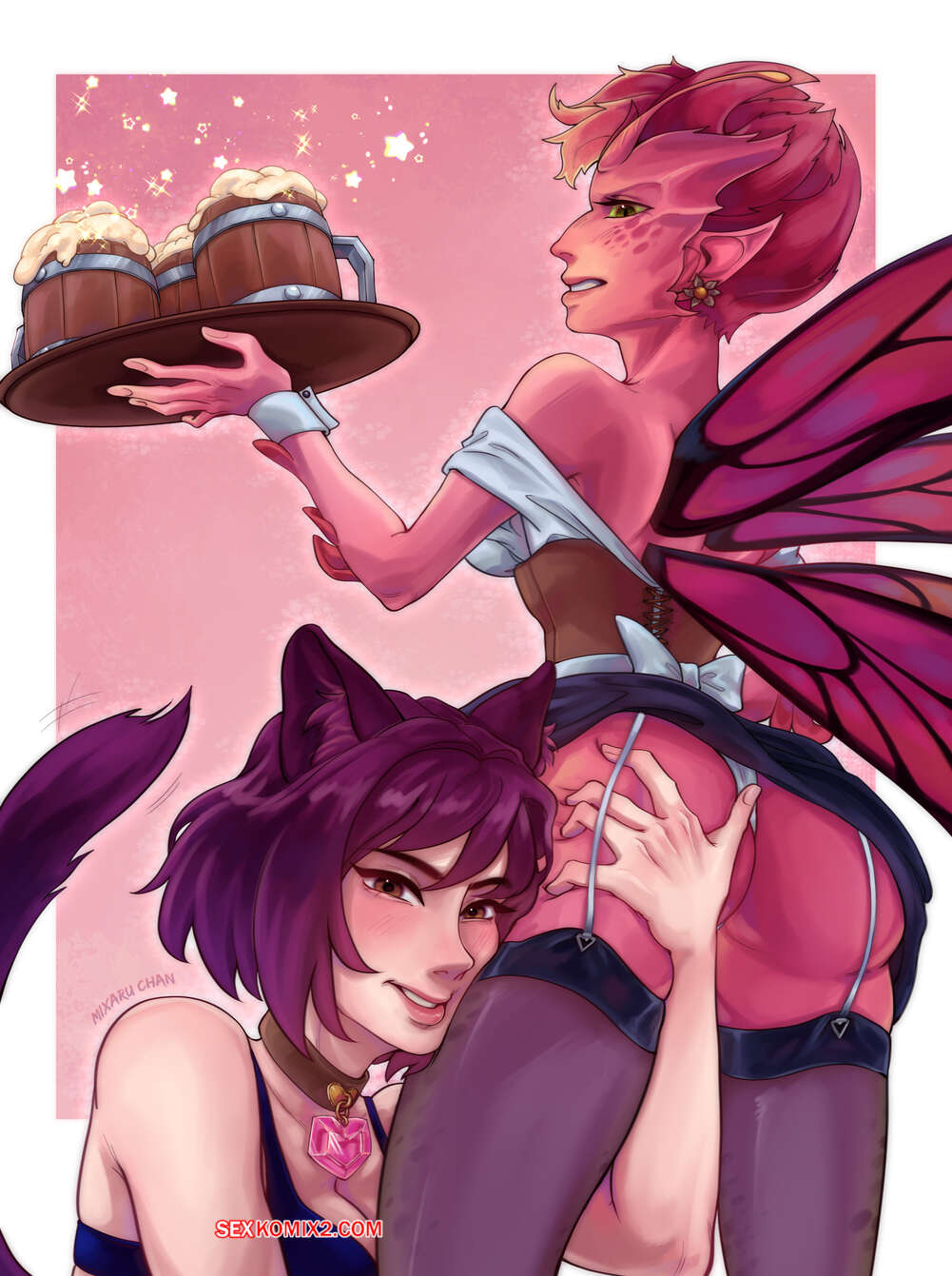 Порно комикс Dota 2. Проигранная дуэль. SH.R0 Красотка напилась в баре и решила повеселиться с горячей официанткой. Она дала ей отсосать свой большой хуй, после чего как следует выебала пизденку брюнеточки.