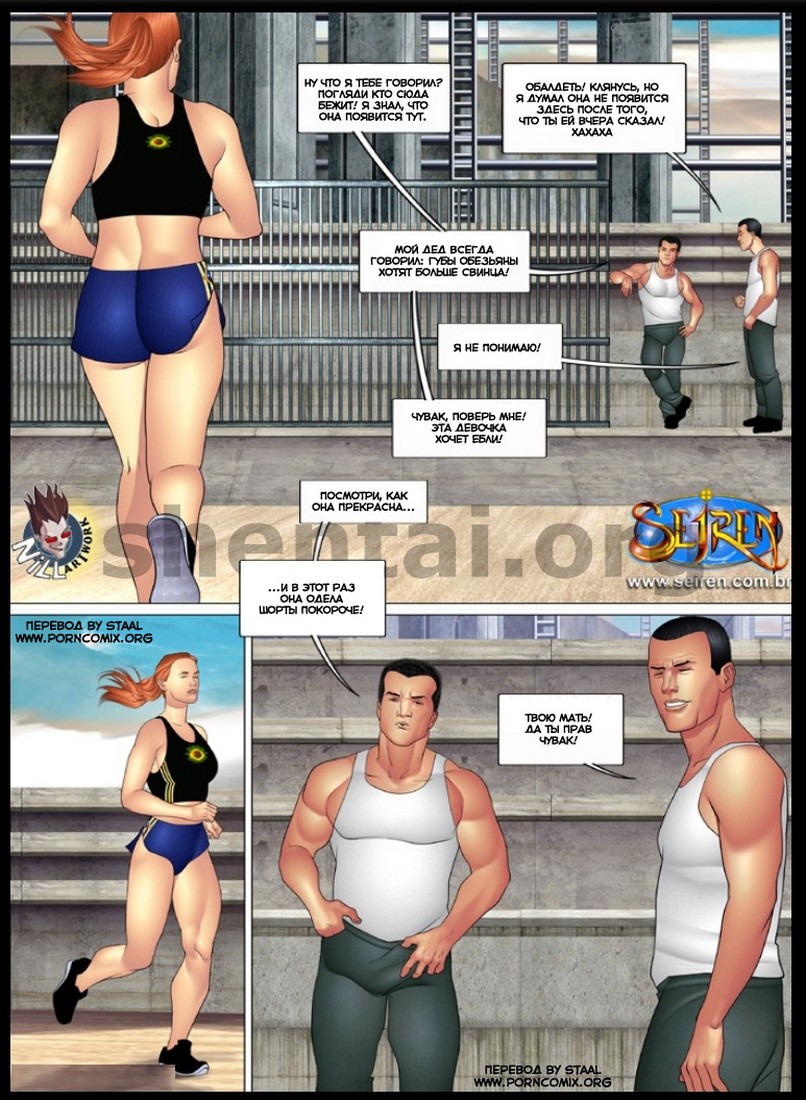 Порно комикс «Спортсменка. Часть 2». После отличного секса, молодая пара проснулись с утра и девушка начала делать зарядку. Муж попросил её не переусердствовать, так как он не любит перекаченных женщин. Супруге это не понравилось, она молча пошла на свою утреннюю пробежку и как обычно остановилась у того дома где за ней наблюдали два парня. Красотка принялась делать разминку, и уже в этот раз парни не выдержали решили познакомится с ней. Они подошли и завели разговор, оказывается она всё это время пыталась их соблазнить. Девушка хочет секса и парни ей в этом помогли, они зашли в дом и устроили тройничок.