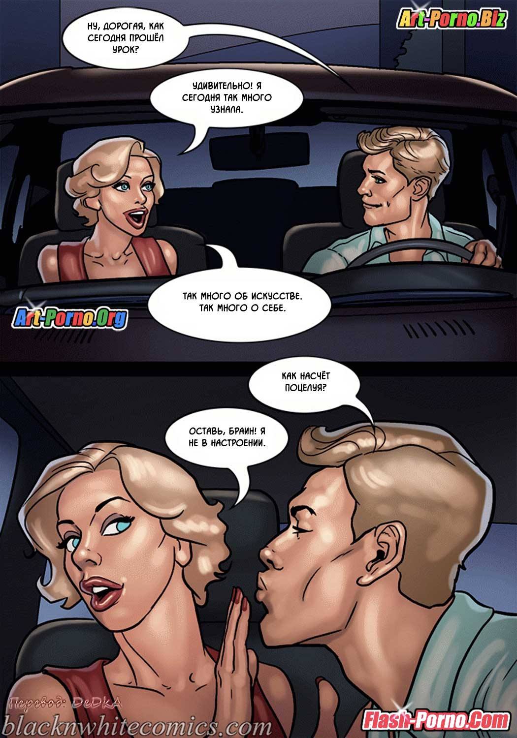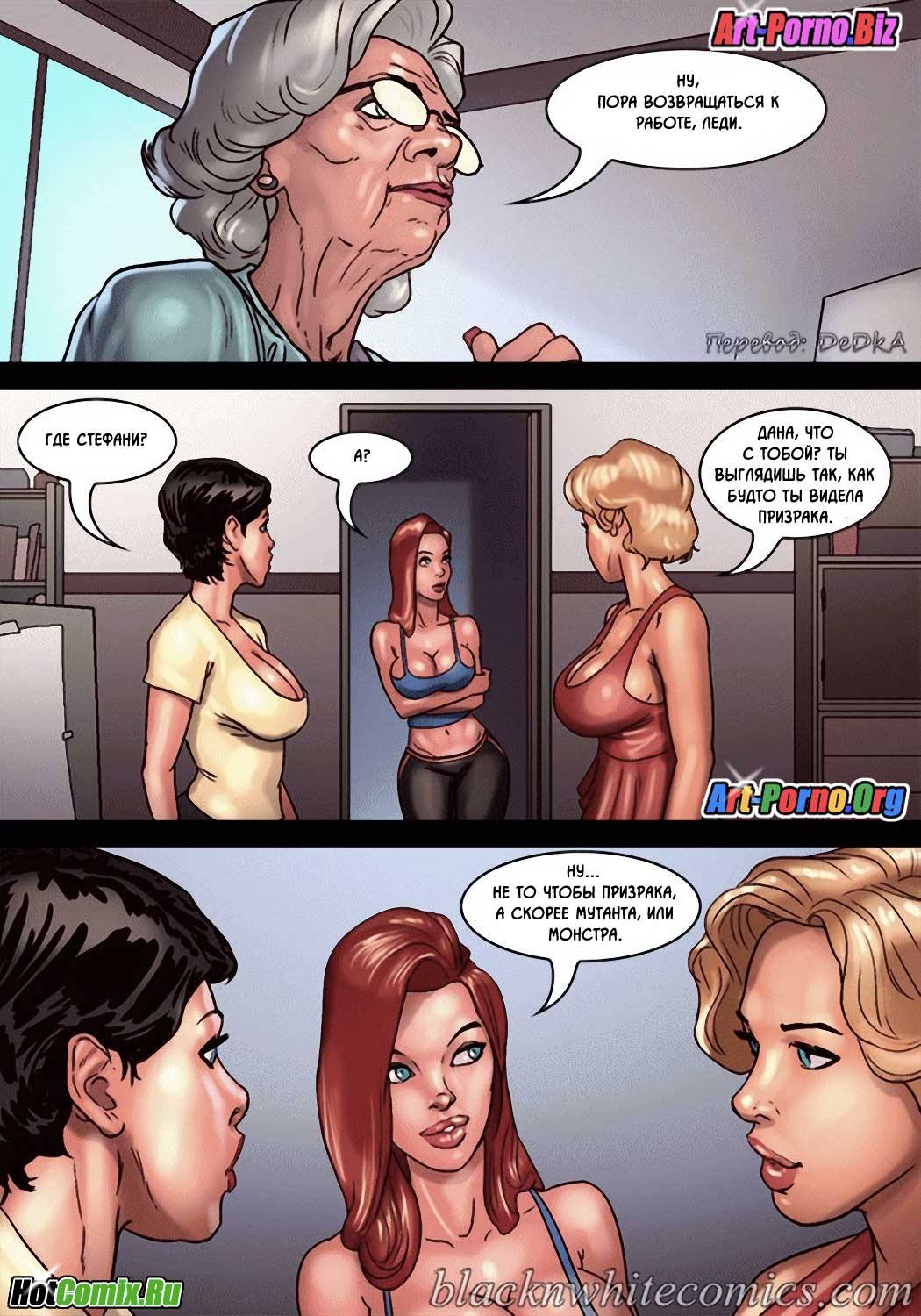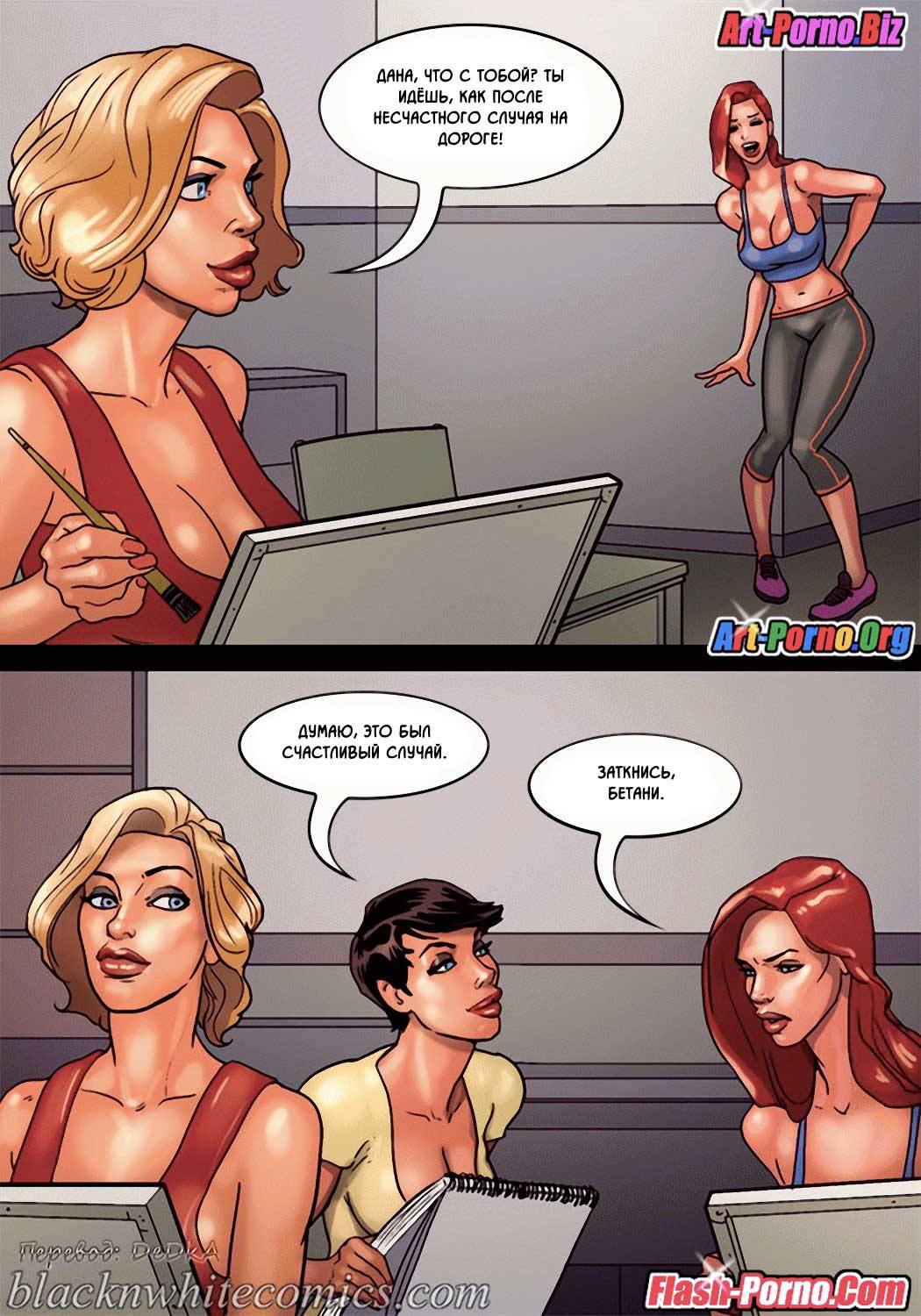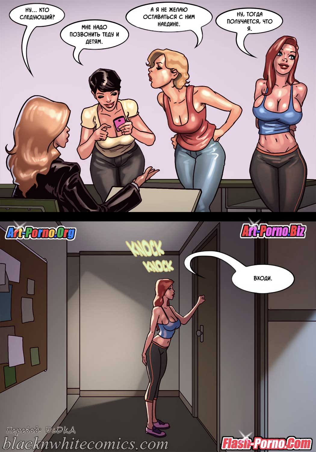 Порно комикс «Художественный кружок». В художественном кружке состоят одинокие девушки, и руководительница этого кружка привела для позирования накаченного мужчину с рельефным телом. Когда он разделся, девушки были приятно шокированы не только от его кубиков на прессе, но и от огромного члена свисающего у него между ног. Вовремя рисования они так сильно возбудились, что начали таскать его по очереди в туалет и трахаться с ним. Даже пожилая руководительница не упустила свой шанс и отсосала ему.