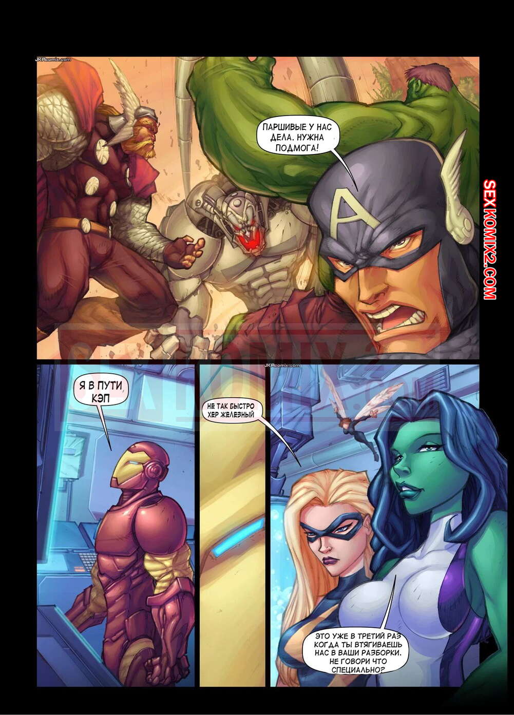 Порно комикс Мстители. Засранцы. Части 1 и 2. Земля озабоченный героев. JKRComix Горячие красотки мстительницы решили повеселиться во время отдыха от спасения мира. Они решили подкатить к Тони Старку и стали ласкать его большой член, после чего дали ему себя хорошенько выебать и получили невероятное удовольствие.